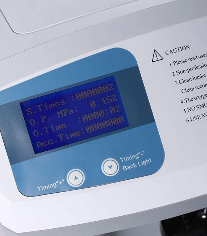 Indicaciones del LCD Presión de operación-Tiempo de uso. Tiempo acumulado, preseteado de tiempo entre 10 min y 40 Hs.